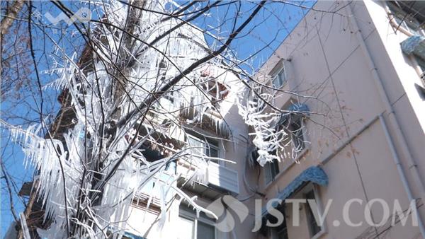 除了居民家中用水难,一些商户也受到了一定的影响。一汽车修理店老板介绍,干活干不起来了,汽车搞美容都要用水,影响很大。此外,一些小区还出现了水管爆裂的现象。现场记者看到一个非常奇特的景象,这棵树从上到下十几米的地方挂满 了冰凌,在阳光照耀下非常漂亮,然而这并不是自然景象,而是今天早上富贵山小区4号楼3幢一处水管因受冻发生爆裂而形成的。
