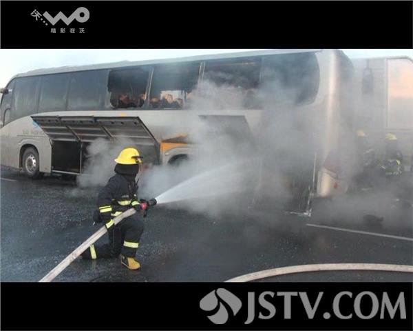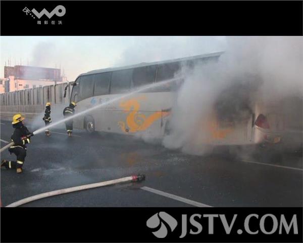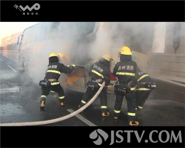 1月26日6时43分,苏州市消防支队姑苏大队接到110指挥中心报警称,位于姑苏区西环高架靠近桐泾医院处有一辆客车着火,情况十分紧急。接到报警后,大队迅速调派特勤二中队3辆消防车18名消防官兵赶赴现场处置。