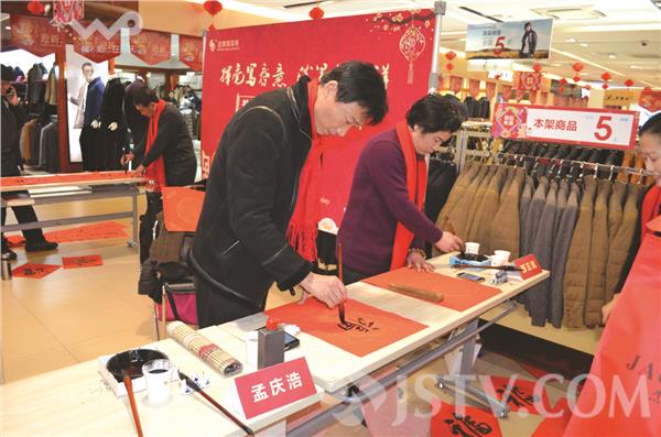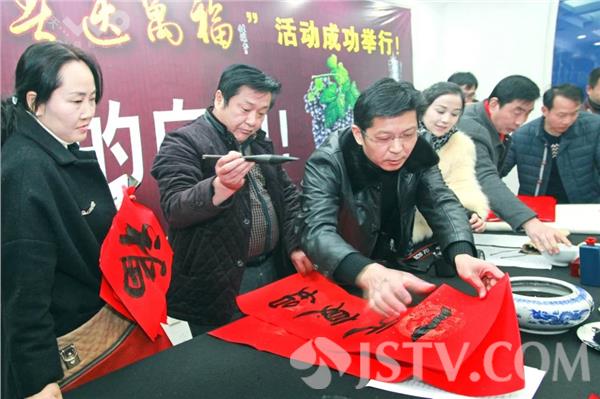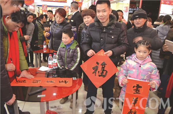 1月27日,盐城市文联组织4位书法家走进射阳县海通镇,到村组、进农家,为农民朋友写春联,写“福”字,送福到家庆新年。同日,滨海县有关企业组织书法家写“福”字、送春联,把祝福送给劳动者。1月26日,盐城市的十多位书法名家走进市中心的建军路地下商业街、金鹰奥莱城,为市民义写作品近千件。书法家义写义赠春联的消息传开后,很多市民拥到现场求字。面对热情的市民,书法大师们气定神闲,铺纸、研墨、提笔、书写一气呵成。楷书、行书、篆书、隶书,各体皆备,有的雄浑奔放,有的工整严谨,精彩纷呈。在现场,市民们小心翼翼地捧着墨迹未干的春联、福字,仔细欣赏。一位市民说“求个墨宝为新年添添喜气,机会难得!”