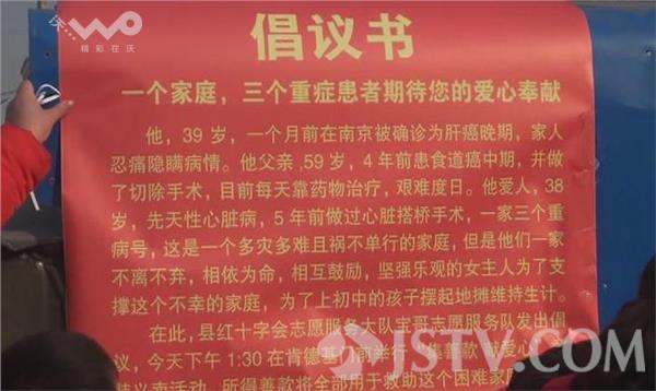 1月27日中午,记者接到响水县红十字会宝哥志愿者服务队的志愿者宝哥电话,他在电话里告诉记者:响水县张集镇村民王女士的公公在四年前因患食道癌开刀,目前仍在服药治疗,而她自己在五年前因先天性心脏病,也做了搭桥手术,为了生计,她的老公外出打工,她自己则开着三轮车赶集摆地摊卖童装,生活还能勉强,然而,老天爷并没有眷顾这个家庭,王女士的老公在今年元月初被查出肝癌晚期,为了照顾老公和筹集医疗费用,王女士要以成本价抛售家中库存的童装,志愿者服务队下午在县城步行街进行义卖和募捐,希望新闻媒体能帮忙报道,为王女士的丈夫筹集更多的治疗费用。