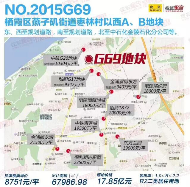 上海鸣翔36.6亿元夺走南京燕子矶G69地块,楼面地价17945元/平米!地价超过周边楼盘房价!去年11月份东方兰园开盘,精装房价才1.8万元/平米。