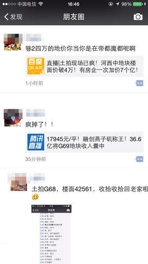 【南京再出地王 地价高达42561元/㎡…】今天下午3点,南京市国土局上演一场有史以来最激烈的土拍大战,9块地50家房企争抢。被誉为准地王的河西G68地块,最终被上海建工和南京奥和经过87轮竞价夺得,楼面地价42561元/㎡。今天南京一天诞生了三个地王。小编整个朋友圈都陷入了一片惊恐和哀嚎,截个图你们感受下: