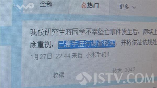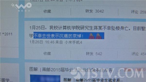 “南邮有人跳楼了”,1月25日早晨9点55分,这则消息在南邮学生的朋友圈中传开。而南邮校方随后发出一条微博:“我校计算机学院研究生蒋某不幸坠楼身亡,目前警方正在调查中。”而警方随后认定,该同学的死系自杀。