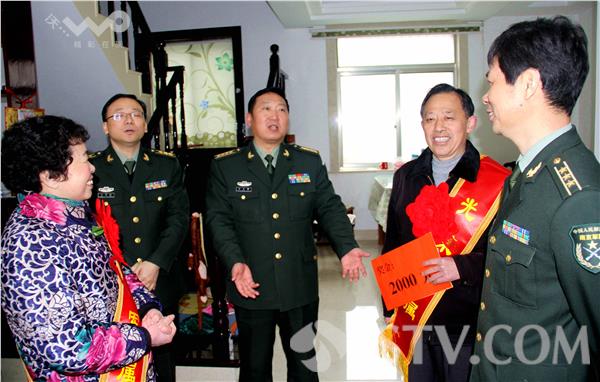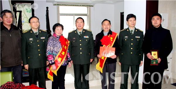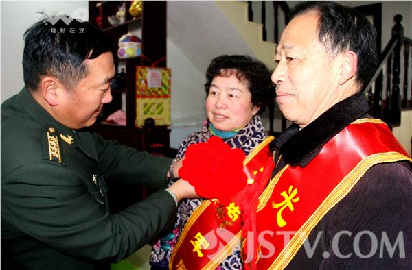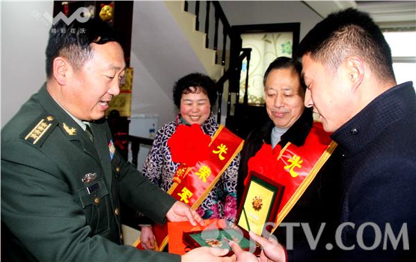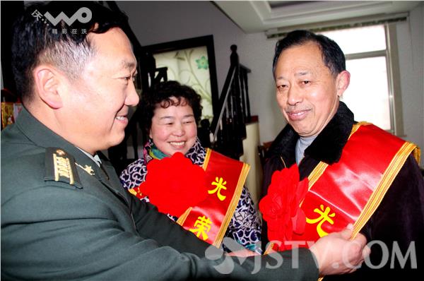 2016年1月30日上午10时,扬州仪征市哨口巷,正在休假的某部营教导员苏晓武家,迎来了一群军地领导。陆军某旅政委解登春在仪征市委常委、市人武部部长韩荣明,政委施家新和市双拥办、真州镇、市民政局等军地领导的陪同下,从安徽滁州防地专程赶来向其颁发军功章,为其亲属送立功喜报,披戴光荣军属授带。