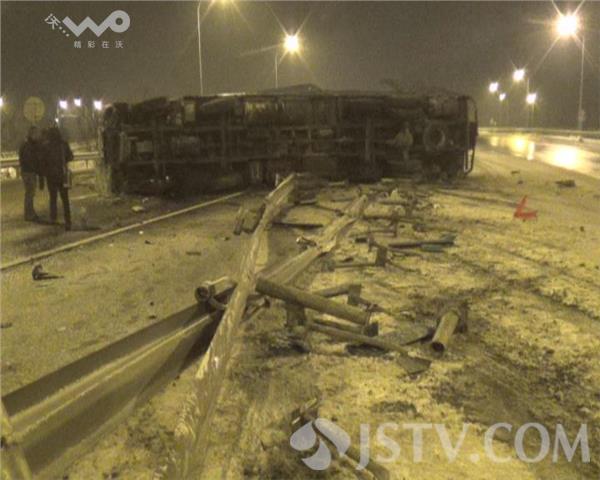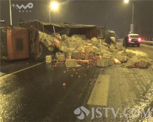 1月31号晚上十点多钟,在扬州古运河大桥西侧,由于雪天路滑两辆货车陆续打滑发生侧翻,其中一辆运输西红柿的货车损失数万元左右,所幸事故没有人员伤亡。