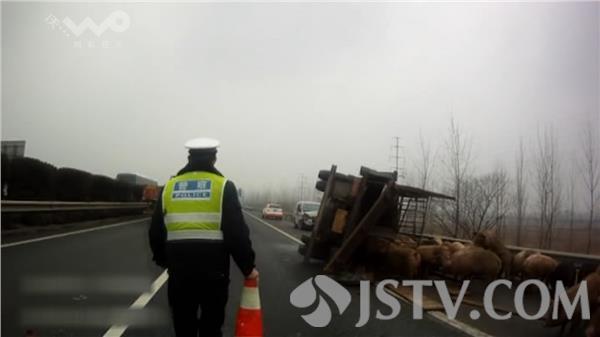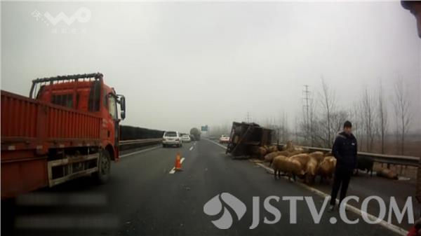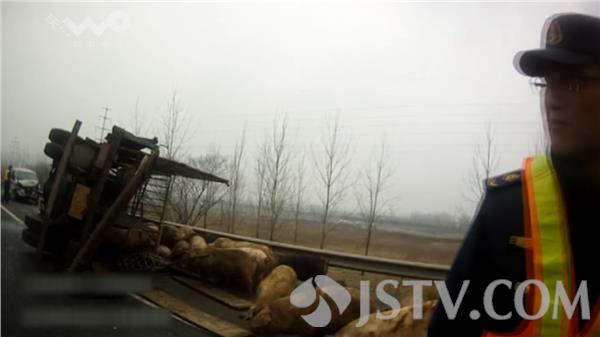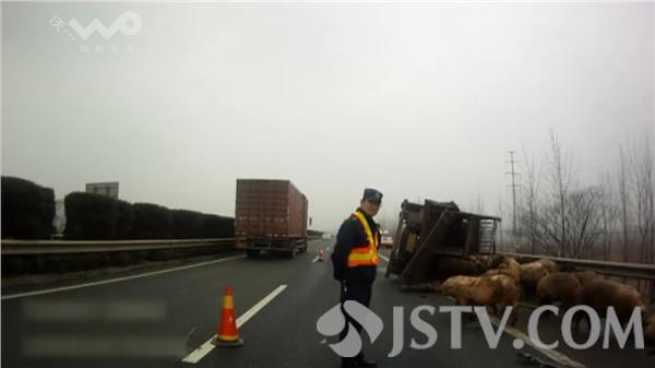 交警赶到现场时,只见货车侧翻在高速公路应急车道上,在货车的后方,几十头猪满地乱跑,在高速公路的护沟内还有十多头猪倒处乱跑。交警立即在事故现场周围设置警示标志,同时让货车司机和随车货主将高速公路上面的猪赶到高速公路的应急车道上。