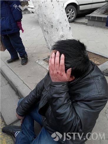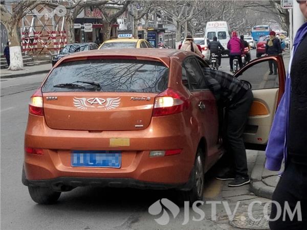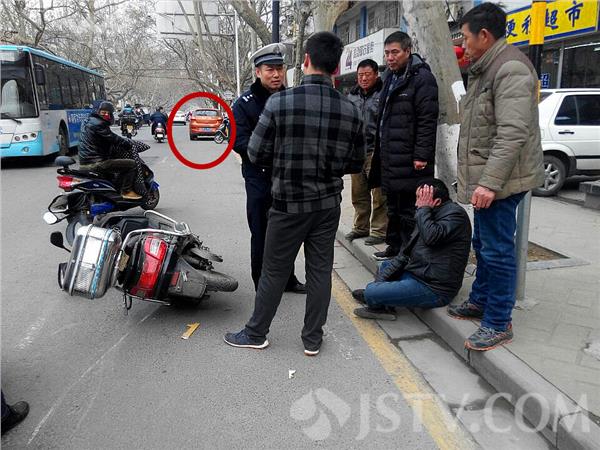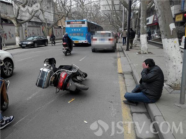 现场看到,南京江宁路3-3号附近,一辆枯黄色轿车停在右侧路边,一辆电动车倒在路中,一位中年男子坐在路牙上,一手捂着额头在呻吟,目前交警已赶到现场,事故原因目前正在调查当中。据了解,骑电动车男子,由南向北行驶至雨花门江宁路3-3号附近时,紧跟其后的一辆枯黄色轿车,由于观察不细,与其电动车男子发生侧面碰擦,骑车人摔倒,造成该男子左侧额头红肿、腿部受伤。随后交警赶到,做了笔录,受伤者送往市一院检查。现场发现,右侧后门有明显一道擦印。交警提醒,春节将至,千万要小心车流、人流的动向,注意安全。徐福庚摄