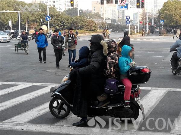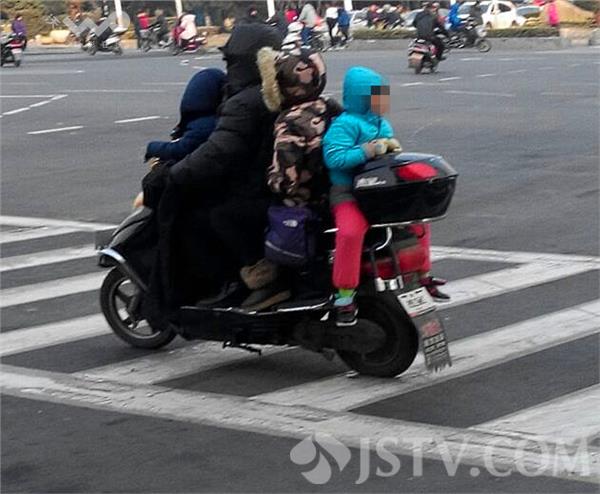 2月5日,南京街头出现在的一幕让人捏了一把汗:一名男子骑着电动车载着3名包裹严实儿童,把电动车当成了轿车,并且从里到外裹得严严实实。虽然能起到保暖作用,但恐怕会因遮挡视线、行动不便很是危险。