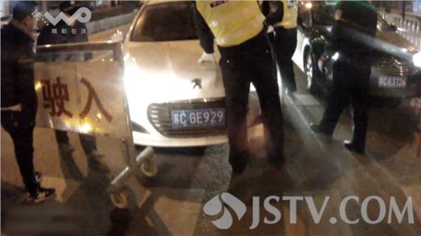 于此同时,当晚9点半钟左右,在淮海西路工人医院门口卡点,民警也查获了一位涉嫌酒驾的女司机。当时这辆白色东风标致轿车在接受检查时,突然加速闯卡,被前方交警用防撞护栏截停。司机也是位女司机,下车后也不好意思,满脸微笑,向交警道歉。