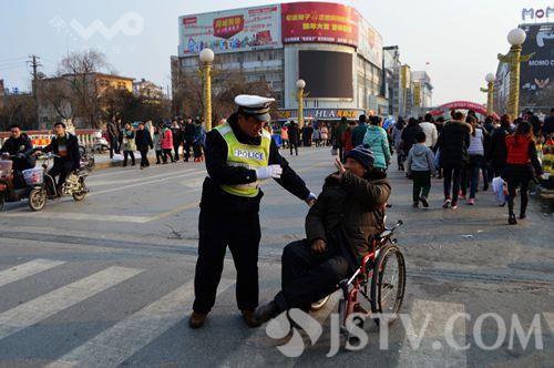 2月9日下午4点钟左右,在盐城市射阳县城红旗路与朝阳桥交汇的路口,由于节日期间的车流大,部分市民争抢通过,导致该路段车多缓行.一名坐在轮椅车上准备过马路的老人过街遇到困难,射阳县公安局交警大队合德中队的一名交通协管员帮助老人顺利通过了该路口。交警提醒,春节期间请让我们为行动不方便的人群多提供一些帮助,让他们也感受到春节的暖意。