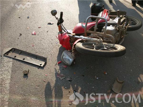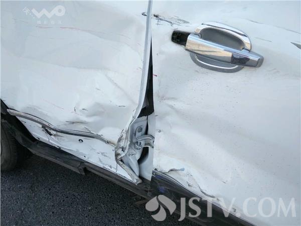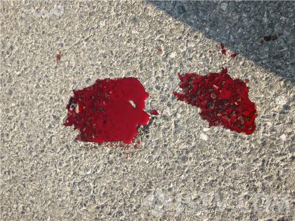 记者在现场看到,事故是一辆别克suv与一辆摩托车的相撞,别克车的右侧车门被撞变形,损伤较为严重,而摩托车的车头部分业已损坏大半,保险杠等零部件经过撞击散落一地,最为醒目的还是地上的两大滩血迹,撞击的惨烈程度,可见一斑。