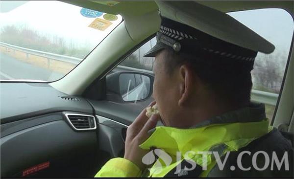 记者随后登高速二大队民警王岩的巡逻警车,而此时的王岩还没有赶上吃早饭,就食堂里拿了几个包子在车上对付一下。王岩警官告诉记者,因为受浓雾的影响,全体民警被紧急召回大队待命,他们有一位同事今天结婚,可能也没有时间去参加他的婚礼了,只能给他一个祝福,希望他能谅解。