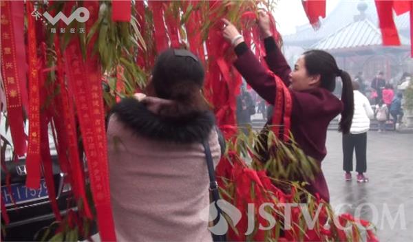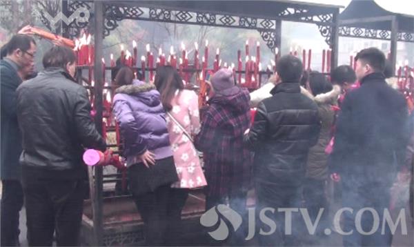 2月12日上午9时,在淮安市慈云禅寺看到,许多淮安市民一大早就赶来烧高香为家人祈福迎财神爷。市民们手捧高香默默祈福,炉台火苗旺盛象征新年红红火火,树上系满了市民的美好祝福。有许多市民都是特意赶来祈福迎财神的,经营商铺的刘女士和朋友也是一早赶到寺庙想为自己和家人讨个好彩头。