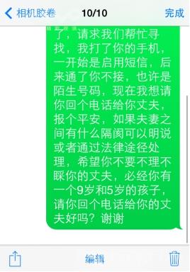 陆渭清了解了详细情况后要了蔡花的手机号码,拨打了好几次都未果,有几次拨通了之后对方立即挂断了电话,几次三番都是一样。陆渭清估计对方以为陌生号码是老公打来的而不肯接听,于是就自己发给对方一条短信,内容如下:蔡花你好,我是大丰区公安局城东派出所(原裕华派出所)的工作人员,你丈夫找不到你非常的着急,请求我们帮忙寻找,我打了你的手机,一开始是启用短信息服务,后来通了你又不接,也许是陌生号码你没有接,现在我想请你回个电话给你丈夫报个平安,如果夫妻之间有什么隔阂可以明说或者通过法律途径处理,希望你不要不理不睬你的丈夫,必竟你有一个9岁和5岁的孩子,请你回个电话给你的丈夫好吗?谢谢!