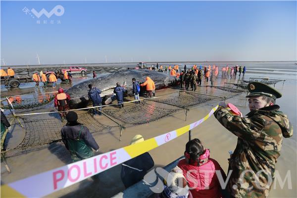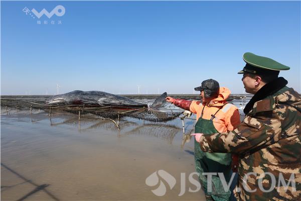 2月14日下午,当地养殖紫菜的渔民在如东县长沙镇三民村滩涂,发现一条鲸鱼搁浅死亡。渔民在第一时间将鲸鱼搁浅的消息报告边防派出所。边防民警及时进行了走访核实,由于获悉消息时正值涨潮时分,不能前往事发海域进行现场调查,便将鲸鱼搁浅死亡的消息通报相关职能部门,并商议次日潮水退去后出海进行调查。