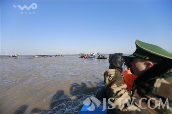 2月15日清晨,边防民警冒着严寒,乘坐渔民出海作业的拖拉机,会同江苏省海洋水产研究所、南通市博物苑、江苏省海洋渔业局等相关职能部门,在渔民的带领下前往鲸鱼搁浅地点开展进一步调查核实。