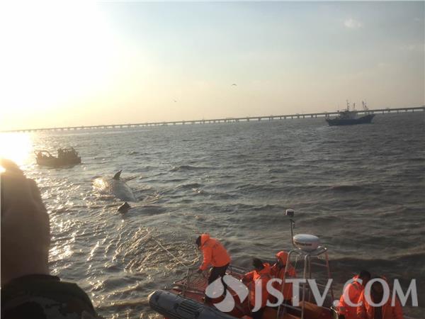 今天(2月15日)下午四点左右,南通洋口港边防派出所民警接报警称,发现了第二头鲸鱼,搁浅了,地点位于2月14日发现的第一头鲸鱼东南方向78公里处,下午四点半当地边防民警赶赴现场,发现该鲸鱼尾巴仍在摆动,并没有死亡,后协助当地渔政部门用缆绳将该鲸鱼尾巴拴住,欲拖回海里放生,在放生过程中发现该鲸鱼死亡,后将其拖至洋口港重件码头待次日南通市博物苑人员处理。如东边防官兵连夜值守保护。大家对这头鲸鱼没有被救活感到很惋惜。