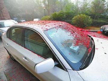 付女士告诉记者,她家住花山湾,去年年底,刚 买了一辆将近30万元的大众轿车,“大年初五上午,我们一家人准备出门走亲戚。刚到车前就发现引擎盖、车顶上有很多黄色的鞭炮燃放后的碎屑,擦了半天黄色 的斑都擦不干净,再仔细一看,还有几个小坑……”她介绍,因为是老小区,没有物业,而且很多人都是半夜放的烟花爆竹,想要找到肇事者几乎不太可能。