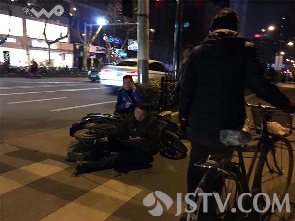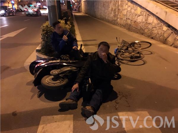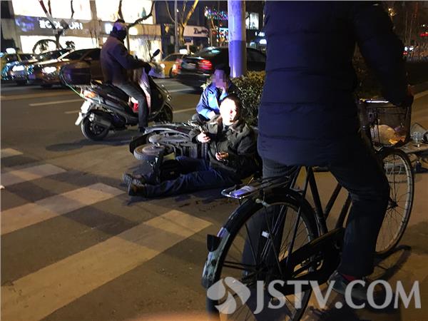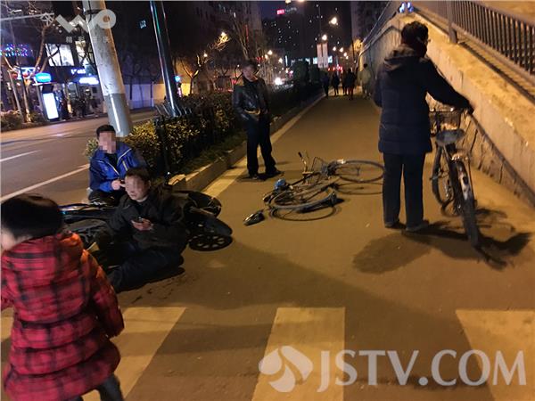 今天(17日)晚上7时15分许,夜幕刚刚降临,在上海路由北向南非机动车道,合群新村路口,一辆自行车与电动车迎头相撞,两车横倒路中,骑自行车的中年男子坐在地上起不来,鼻孔流血,鲜血流淌一地,场面惊心动魄。