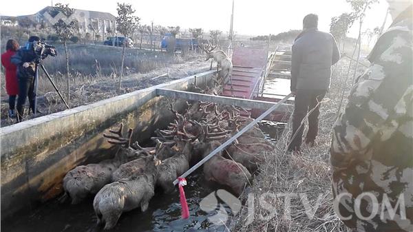 2月17日12时许,江苏边防总队盐城支队川东港边防派出所接到群众报警电话,称有二、三十头麋鹿陷入川东闸东侧的东方绿洲的引水渠里,无法脱困,请求派出所救助。接警后,该所民警立即驱车赶至现场对被困的麋鹿展开救助。。