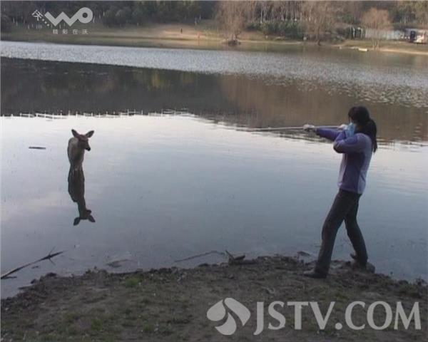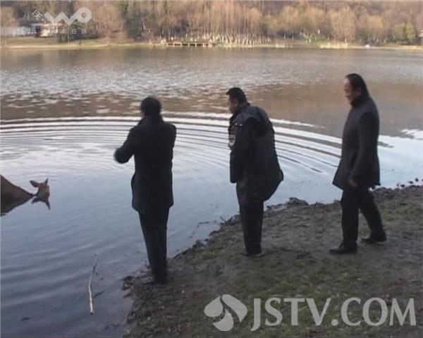 荔枝新闻记者赶到时,这只鹿已经蹚入两尺多深的水里,一动不动,两只小耳朵始终高耸着,如同一座雕塑。一名知情市民表示,鹿入水前曾遭到人的追赶和围观,可能因此受了惊吓,误入水中。虽然这只鹿在水中暂时摆脱了人的追赶,但它的安全也引发了市民们的担忧。担心其会因水温过冷而生病。接到市民电话求助后,红山动物园的兽医赶到了现场。在查看情况后,兽医确认,这是一只成年雌性梅花鹿,为国家一级保护动物。兽医们简单商量后,决定用吹管对梅花鹿实施麻醉。果不其然,被吹管射中后,没多会儿,梅花鹿开始东倒西歪,跌跌爬爬地往岸上来。见此情形,景区保安和多名热心市民合力上前、将梅花鹿从水里抬了上来,并第一时间把它送往动物园。