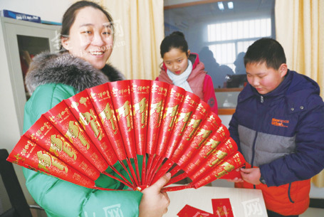 金山网讯 过年的红包用过之后你还随手丢掉吗?昨天,润州区金山街道银山门社区志愿者组织辖区小朋友开展“废旧红包再利用”活动,将用过的红包制作成精美的折扇,作为装饰,非常喜庆。文雯 摄影报道