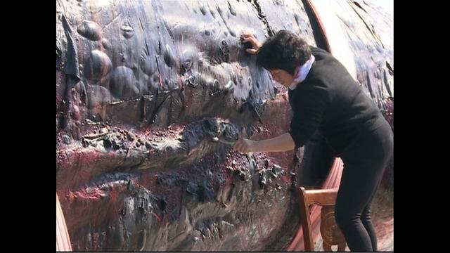 厦门水陆生物研究所专家袁红梅表示,她采用的是剥制标本,也就是把抹香鲸体内肌肉组织剥离,通过鞣酸去脂、碱酸鞣制然后加脂,把抹香鲸尸体像皮衣一样,把它制成浮皮,去除异味油脂,增加保存年限。里面会采用泡沫填充,标本制作大概要五个月左右。