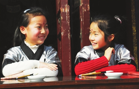 下午2点,百余名身着汉服的学生在大成殿前参加集体开笔礼仪式。随着主持人的口令,这群额头点着朱砂的孩子正正衣冠,双手相合,九十度鞠躬,拜谢先圣孔子,感谢父母让自己进校求学,开蒙启智。接着孩子们又抽出身下的米字符,一笔一画,认真写起了“人”字。据现场的工作人员介绍,让孩子们书写“人”字是希望孩子们学会做人,不仅要顶天立地,而且能互相帮助,共同进步。