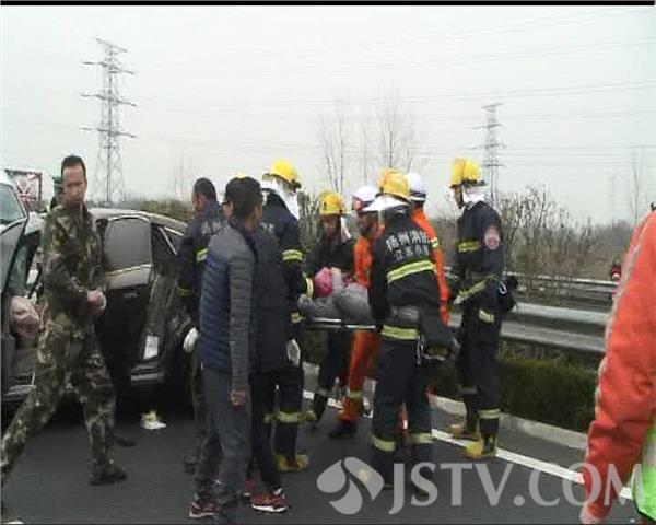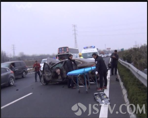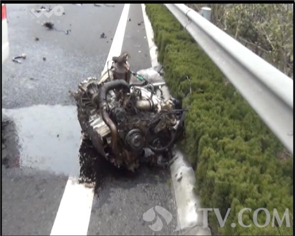 2月21号下午两点,G40高速扬州仪征段,一辆轿车行驶途中突然追尾前方的槽罐车,巨大的冲击之下,轿车发动机被撞掉了下来。