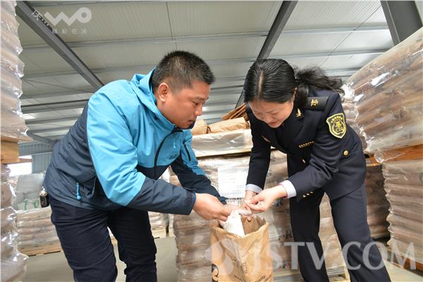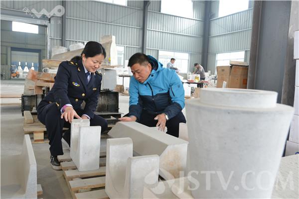 图为镇江检验检疫局产地证签证人员在镇江市中铸耐火材料有限公司对即将出口秦国的耐火材料进行产地证调查,确保原产证签发的准确性。