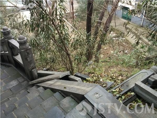 根据指引,笔者找到该处途坡护栏。现场看到,倒塌的石制护栏长约10多米,纵跨3段台阶,据知情者称,这些护栏倒塌已有10多天,一直无人修复。越过该段护栏,下面就是垂直落差达10多米的一处悬崖,游客尤其小孩一旦经此坠落,后果不堪设想。现场查看,倒塌的护栏与立柱的接隼口深度竟不到1公分,即使连接完好,游客稍用力碰撞,护栏都能倒下,如此“深度”连接不免让人困惑,难道该处城墙途坡上的护栏仅仅是用做摆设的吗?