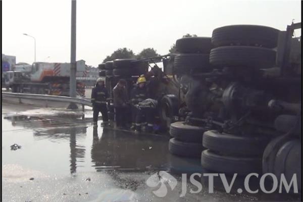 据了解,槽罐车从江都开往安徽,车上装载23吨液化石油气,当时前方有辆桑坦纳轿车错过出口,紧急刹车准备转向,槽罐车司机发现时便刹车,可已经来不及了,方向失控,撞断护栏侧翻。驾驶员和押运员受伤,被随即送往医院治疗。随后,救援人员在槽罐车上系好钢丝绳,利用吊车的牵引力,将槽罐车吊正,同时不断向钢丝绳喷水,防止操作过程产生火花。罐体吊正后,现场更换掉毁坏的槽罐车车头,开至安全区域,进一步处理。所幸处置及时,罐体未发生爆炸。目前,事故具体原因正在调查中。