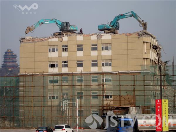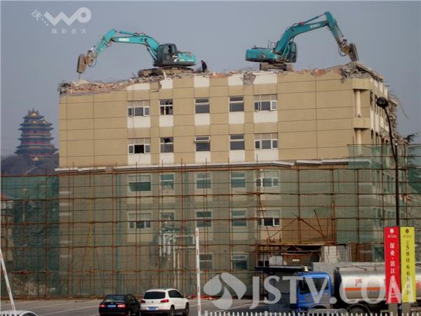 今日(2月26日),南京鼓楼区大马路附近一座大楼顶层上,两台挖掘机登上10几层高楼楼顶上作业。令周围市民既惊奇又担忧。