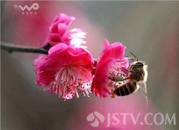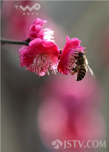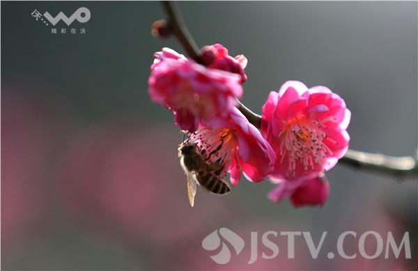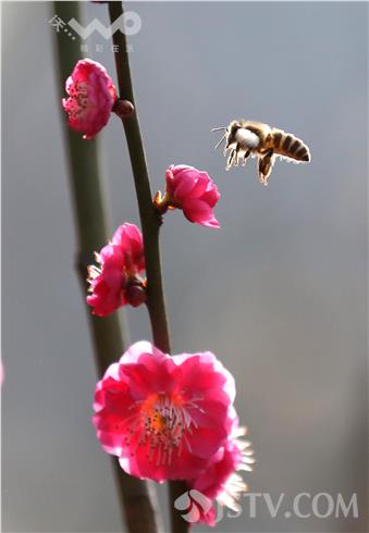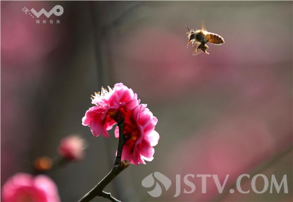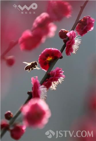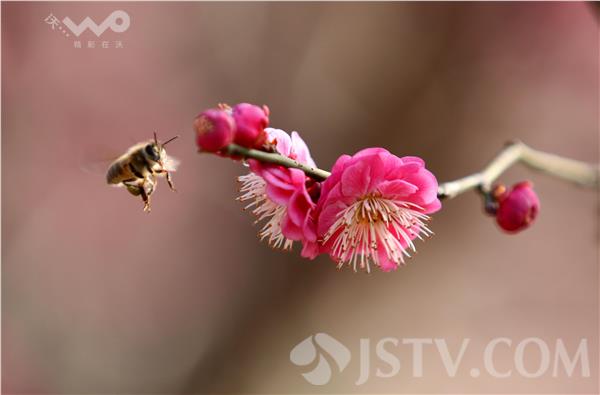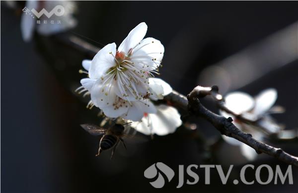 2月27日,随着天气回暖,南京古林公园的梅花竞相绽放,吸引成群的蜜蜂绕花飞舞、采蜜忙碌,春的气息在花开蜂舞中悄然来临。