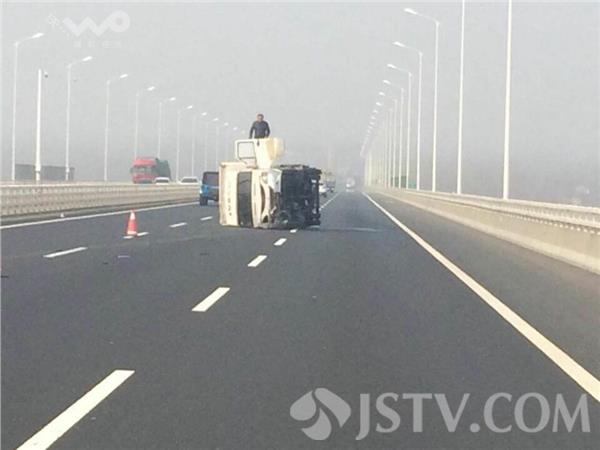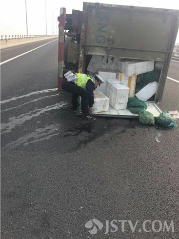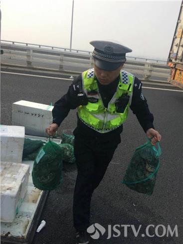 2月28日下午,一辆苏NG9138厢式货车由于后轮爆胎,车辆在南京四桥高速公路跨江大桥上侧翻,所幸未造成人员受伤,然而厢体内满载的一车螃蟹散落一地,民警到场后,及时帮助货主捡拾螃蟹,减少了财产损失。
