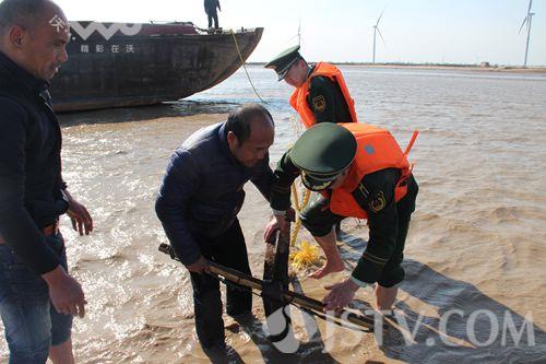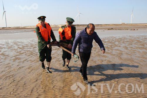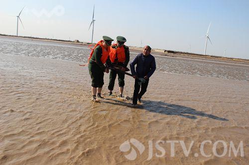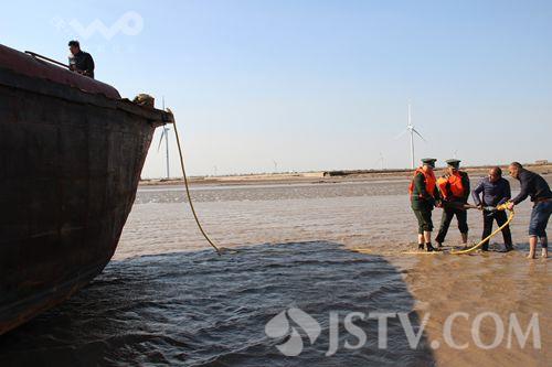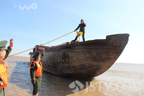 2月28日晚上10点半钟左右,一艘浙余杭货00666号货船行至射阳县扁担港附近海域时,因海上风大浪急,在航道不熟悉的情况下,误入到海边的滩头,与暗石发生碰撞搁浅,导致船舱进水,三名船员被困,盐城边防支队扁担港边防派出所接到求救报警,迅速组织警力赶到现场,将三名被困船员营救到岸边,船只就地抛锚。凌晨时分,船只的锚链被大风刮断,剩下一只小铁锚固定船只,一旦风力加大或海水上涨,随时有可能导致船只倾覆或失去控制,情况一度十分的危急,再次接到求救报警的盐城公安边防支队扁担港边防派出所迅速组织警力赶赴海边展开救援工作。