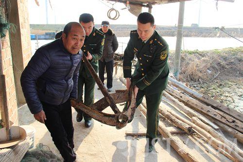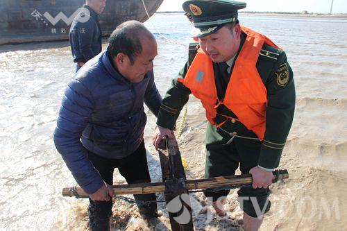 记者从派出所执法记录仪拍摄的视频里看到,参与救援的民警对现场进行勘查后,认为必须尽快找来新的铁锚将船只固定,才能确保安全,而附近没有销售铁锚的门店,救援的边防民警随即驱车三十多公里,赶到滨海县的二罾渔村那里,购买了一只重达一百多公斤的铁锚送到海边。由于货车搁浅的地方距离岸边还有三、四百米远,如果靠船员自己来远送铁锚到船上的话,需要耽误很长时间,见此情形,参与救援的边防派出所所长卢波、民警冯凯等人脱下鞋子,与货船上的船员一起,在接近冰点的海水中将一百多公斤重的铁锚抬到货船的旁边,并帮助将铁锚固定。参与救援的扁担港边防警官冯凯告诉记者,由于货船现在只有一个小的铁锚在固定,如果不及时对船只进行固定,货船就会发生漂移或者倾倒,造成更大的损失。