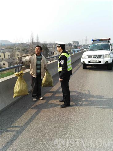 2016年2月29日下午2时20分许,镇江交警高速二大队民警网上巡逻时,突然发现扬溧高速扬州往溧阳方向18公里附近应急车道上一名行人挑着担子在高速公路上行走,便立即指挥民警应福台和辅警张国文赶到现场,将这名准备步行一千多公里去厦门的男子带离高速公路。