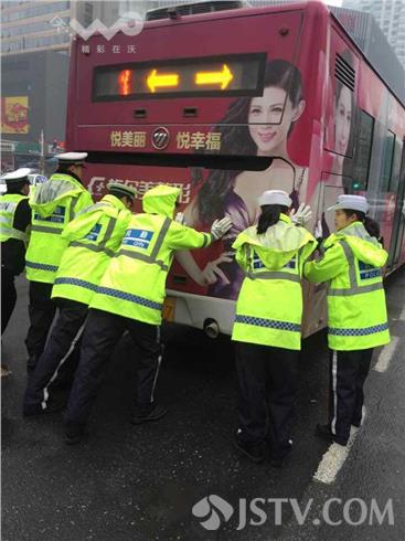 南京新街口广场北口左转通往中山东路的拐弯道只有两股,同时转弯的公交车众多,随着早高峰的逐渐临近,势必对车辆通行造成困难。同时抛锚地点属于一二大队的辖区交界口,副中队长樊萌当机立断。首先立刻联系指挥中心,请求一大队的支援,并委派民警张灵妍在原地疏导过往车辆绕行。其次,待一大队支援警力们来到现场后,与民警们、司机简单商议后,决定将公交车推至不影响通行的地方。在众人合力下,将车辆推至不影响通行的地方,最终交通恢复了畅通。