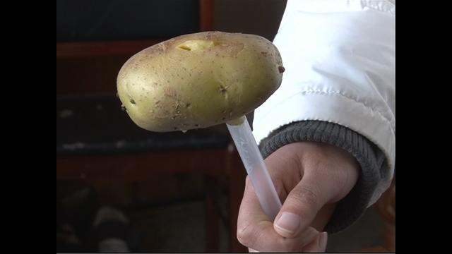 经过医生处理,童童已无大碍,医生表示要是力量再大些,吸管很有可能刺穿童童的嘴巴。吸管怎会有这般威力?记者找来了一个土豆和两种不同的吸管做了一个实验。用大拇指抵住奶茶吸管的一端,瞬间使力刺向土豆,坚硬的土豆居然被吸管轻而易举刺穿了。记者拿起牛奶吸管用同样的方式刺土豆,也能把土豆刺穿。