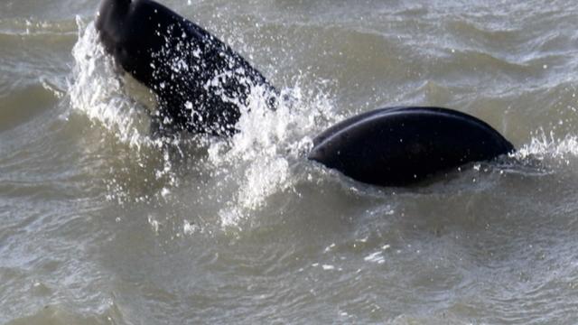 只见这些大家伙,脊背乌黑发亮,聚集着在江面畅游,它们有时一前一后地跟着,时而并排戏水。游到岸边时,市民不仅能看清它们头顶上的喷气孔,还能看见超萌笑脸,听到沉闷的吐气声。
