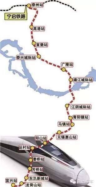 连淮扬镇,2014年12月28日已开工建设,全长305.2公里,设董集站、灌云站、灌南站、涟水站、淮安东站、宝应站、高邮北站、高邮高铁站 、邵伯站、扬州南站、江都站、泰安站、镇江大港站、横山站、丹徒站和镇江站16个车站,设计时速250公里/小时,预留300公里/小时,预计2019年9月建成通车。 3、沪泰宁城轨:将苏中城市融入上海都市圈