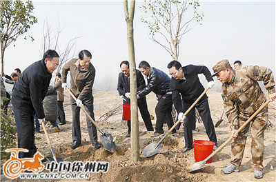 春回彭城万物苏,又是一年植树时。3月2日上午,位于新城区的故黄河滨河公园沿岸,一派热火朝天的植树景象。我市党政军领导来到这里带头参加义务植树活动,为建设生态家园挥锹添绿。市委书记张国华,市人大常委会主任刘忠达,市政协主席李荣启,市委副书记、秘书长夏文达等市四套班子领导,驻徐部队首长羊敏君、许红照、房益旺、王宁等参加植树活动。