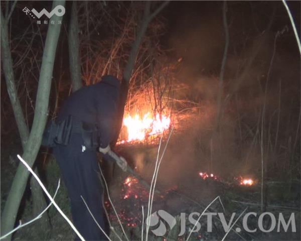 记者赶到现场时,发现路东一侧荒地里有多处着火点,虽然火势不是太大,但腾起的烟雾已经弥漫周围上空,加重了本来就是雾霾的天气,老远就能闻到一股焦味。随后八里派出所民警赶到,用木棍拍打着火点,进行灭火。记者发现被烧着的有许多倒地树木、地面落叶,零星着火点有七八处,很快一处芦苇群也被点着,火势大了起来。但由于芦苇面积不大烧尽后火势逐渐变小,警方对剩下火点进行扑灭。