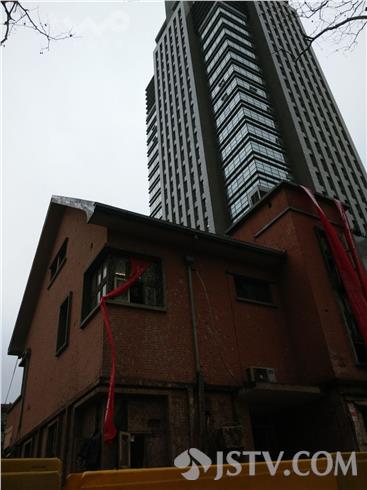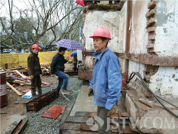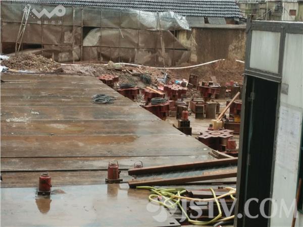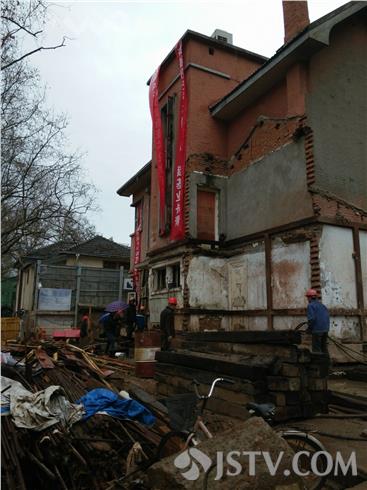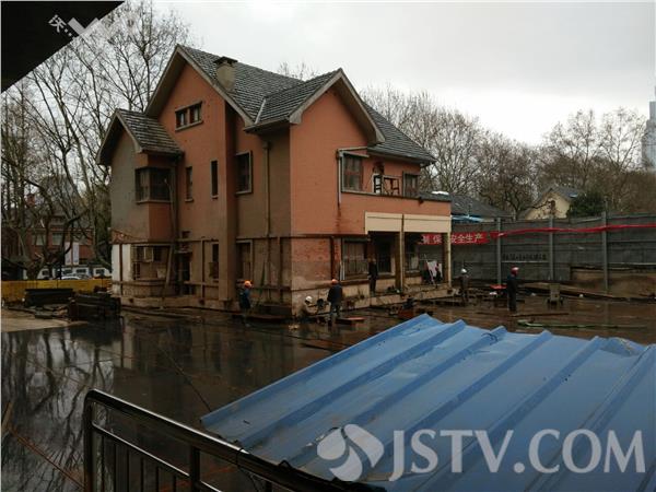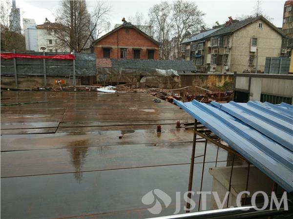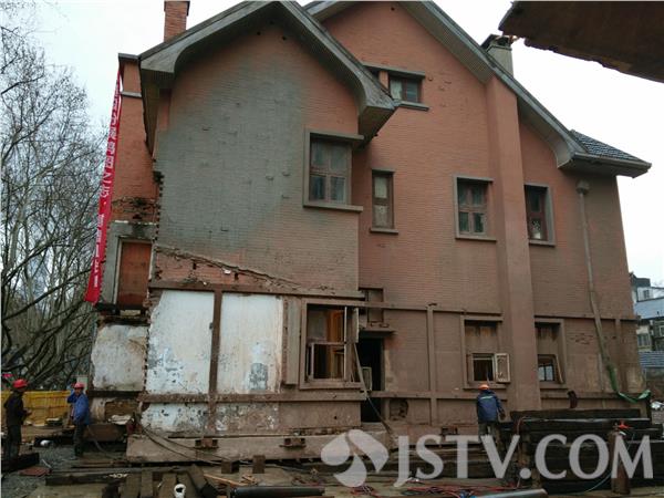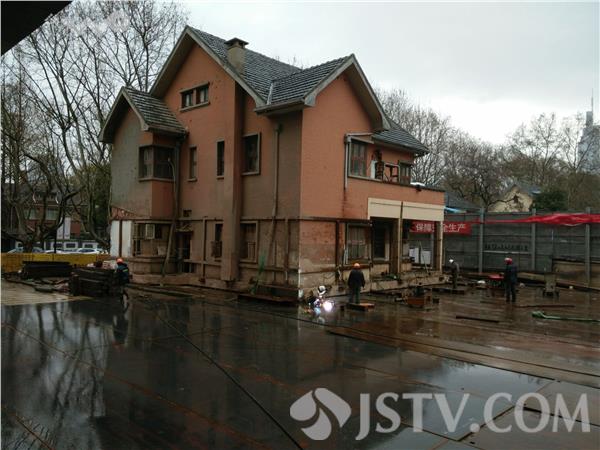 今天,3月8日上午,下雨,荔枝新闻记者来到现场观察,看到,这幢民国建筑整体座落在一块厚实的水泥板上,水泥板下有许多根钢管似的“轮子”,可滚动的。而这座民国建筑就是依靠下面的钢管似的滚轮,带动水泥板块移动而移动的。共平移了约90米。即去年上半年从原地向南移,现在,又回移到原位置。这个项目的名称是“民国建筑修缮及地下停车库建设。”项目实施甲方是江苏省财政厅。