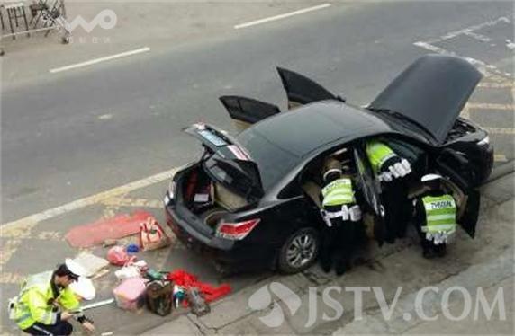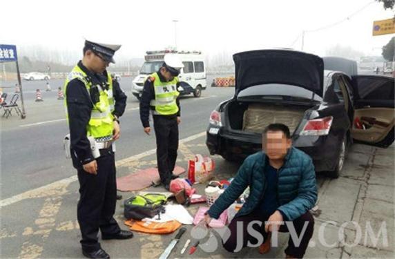 近日,南京交警高速二大队民警在二桥公安检查站对一辆皖C轿车进行检查时,发现车辆违法安装警报装置,后备箱内搜出砍刀1把,小刀2把,后经网上核查,发现驾驶员驾驶证已于15年9月过期,民警依法对车辆和刀具予以扣押,并将对其违法行为进一步调查处理。