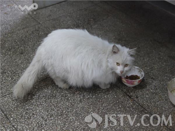 大白猫被相救后,伍先生用食喂它,随后,大白猫在大院内高声地“喵喵”叫唤,好似感谢大家相救之恩。