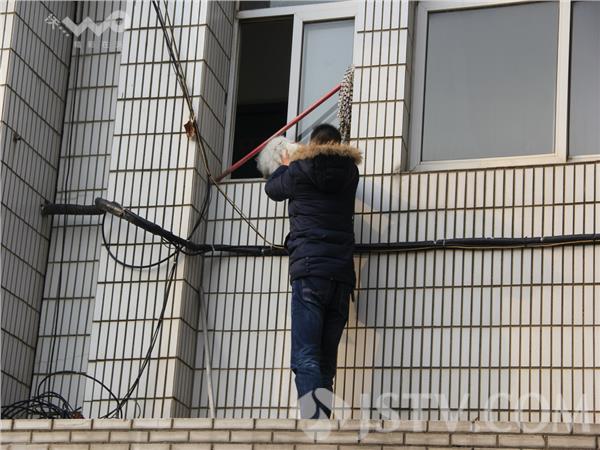 早晨8点左右,在煤炭港一大院内,几位好心市民听到大白猫叫唤,开始采取营救,有市民在屋檐下叫大白猫“小安子”快跳,我会接住你,引大白猫爬上窗户,可是经过20多分钟的营救方法,没有获得成功。