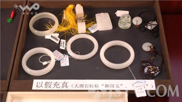 在发布会现场,展示了部分不合格产品,这两款就是绿色、白色的玻璃假冒的。 除了用玻璃仿制很多珠宝制品,用低劣的石英岩、大理石假冒天然翡翠、和田玉则更为常见,在专业人士眼中,它们也是破绽百出。