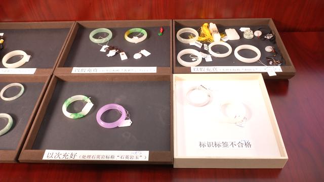 在发布会现场,展示了部分不合格产品,这两款就是绿色、白色的玻璃假冒的。 除了用玻璃仿制很多珠宝制品,用低劣的石英岩、大理石假冒天然翡翠、和田玉则更为常见,在专业人士眼中,它们也是破绽百出。